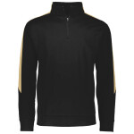 Heavyweight 100% polyester matte brushed tricot * Tag-free label * Quarter zip pullover style * Contrast color inserts * Set-in sleeves * Front pouch pockets * Self-fabric cuffs and bottom band